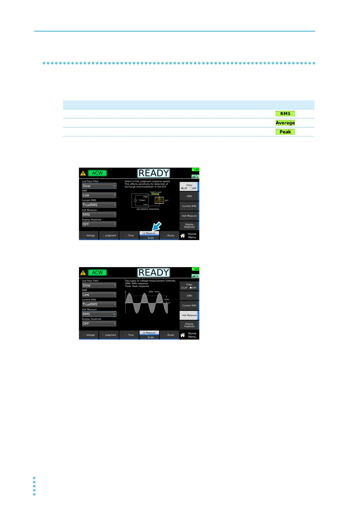 Sets the voltage measurement mode. An icon appears during testing according to the setting.