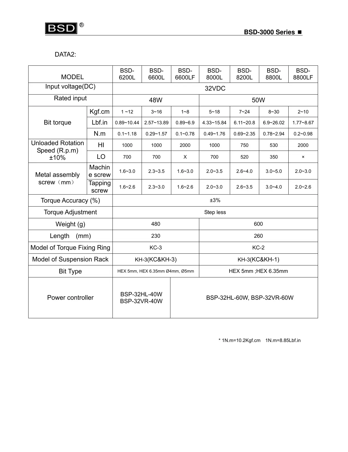 * 1N.m=10.2Kgf.cm 1N.m=8.85Lbf.in