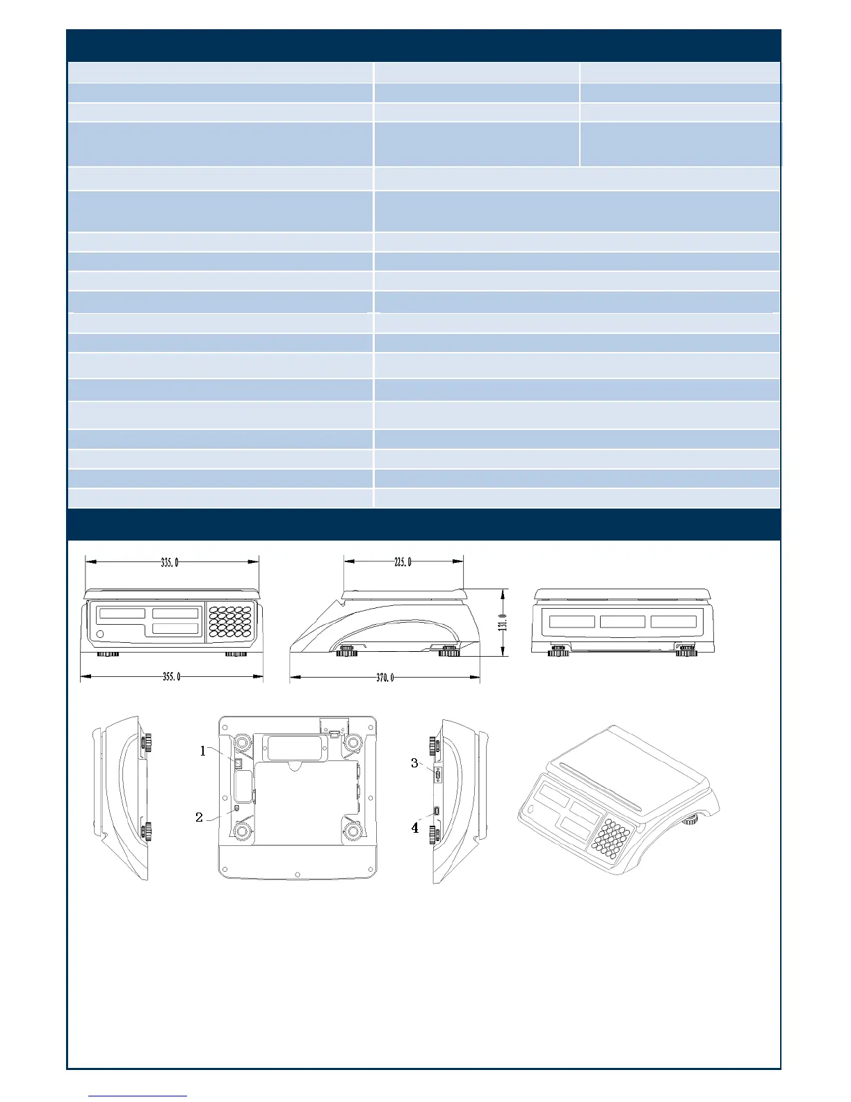 Interface: (1) Main switch (2) AC power adapter input (3-4) RS232 and USB