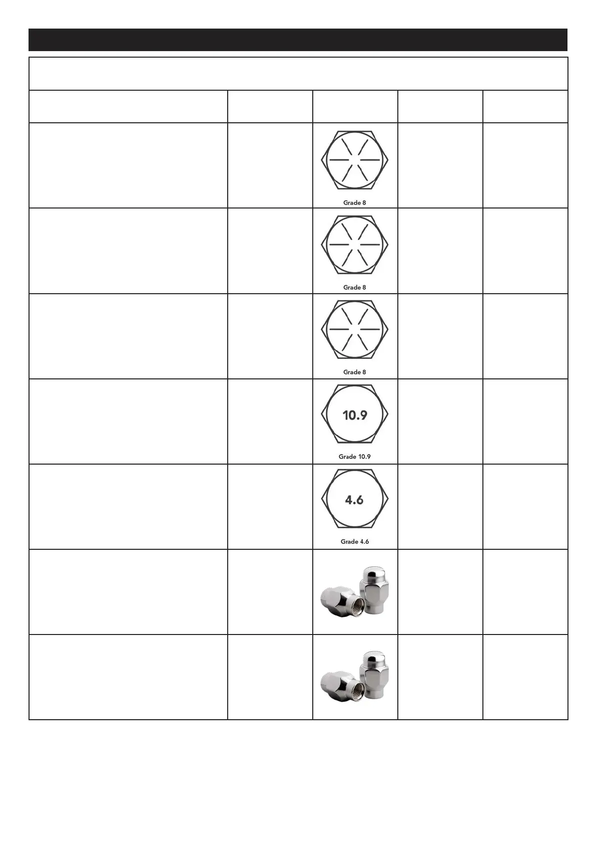 • Ensure the correct bolt and nut has been used as shown in the table for the correct component xture.