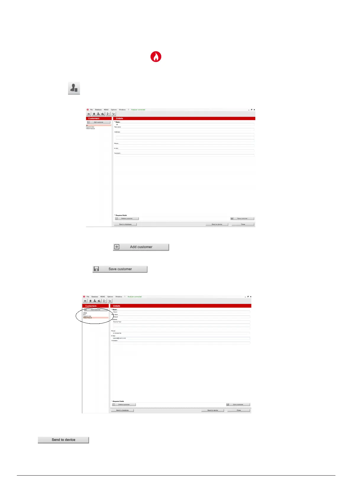 ➢ To transfer a customer to the analyser, select it on the customer list on the left of the screen and click on the following button: