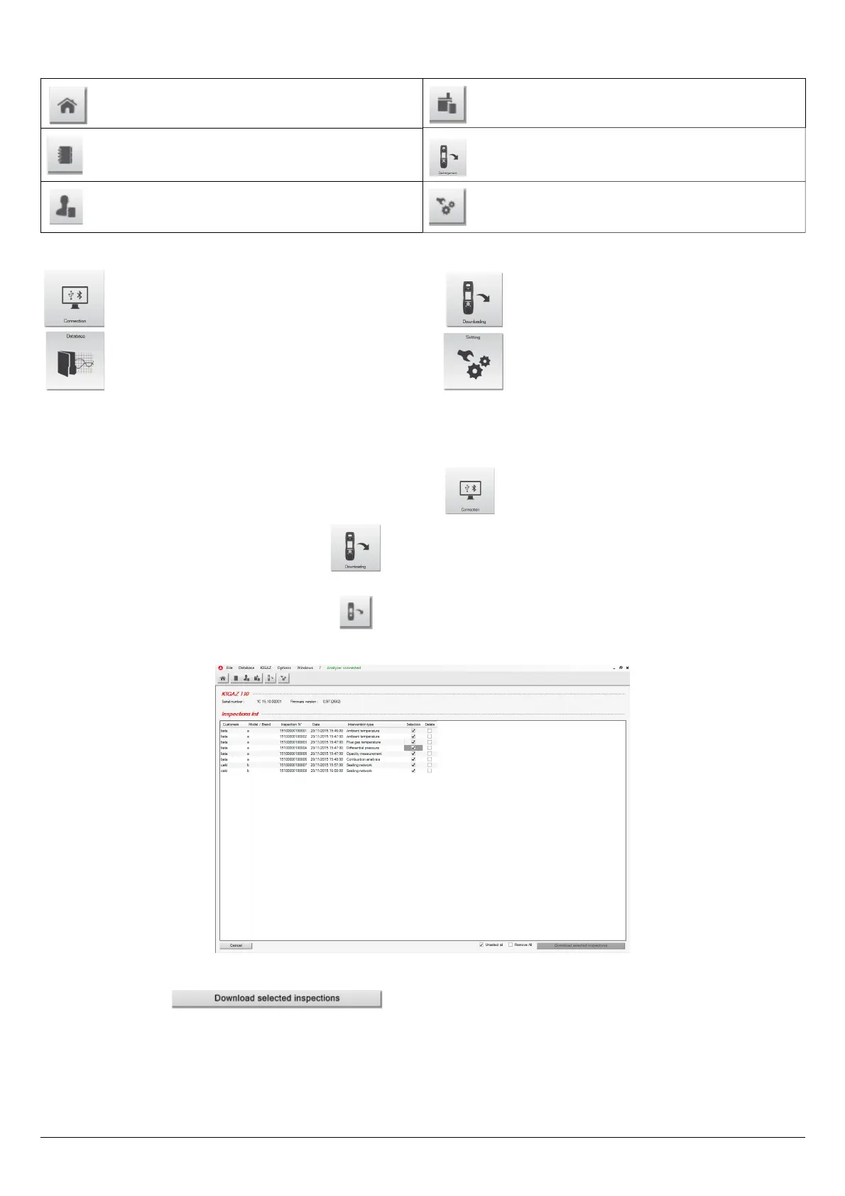 ➢ Tick the boxes corresponding to the inspections to download on the computer. To delete an inspection from the instrument,