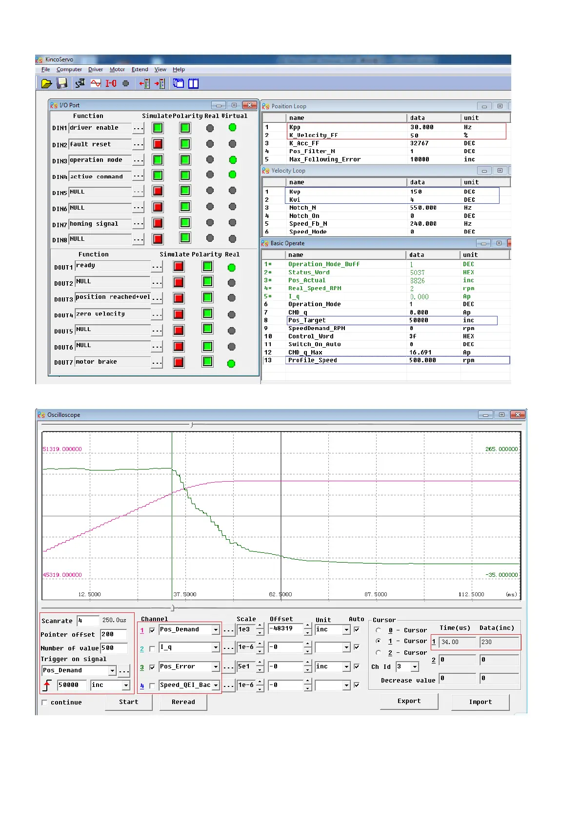 The oscilloscope is as following:max. following error is 230 inc.
