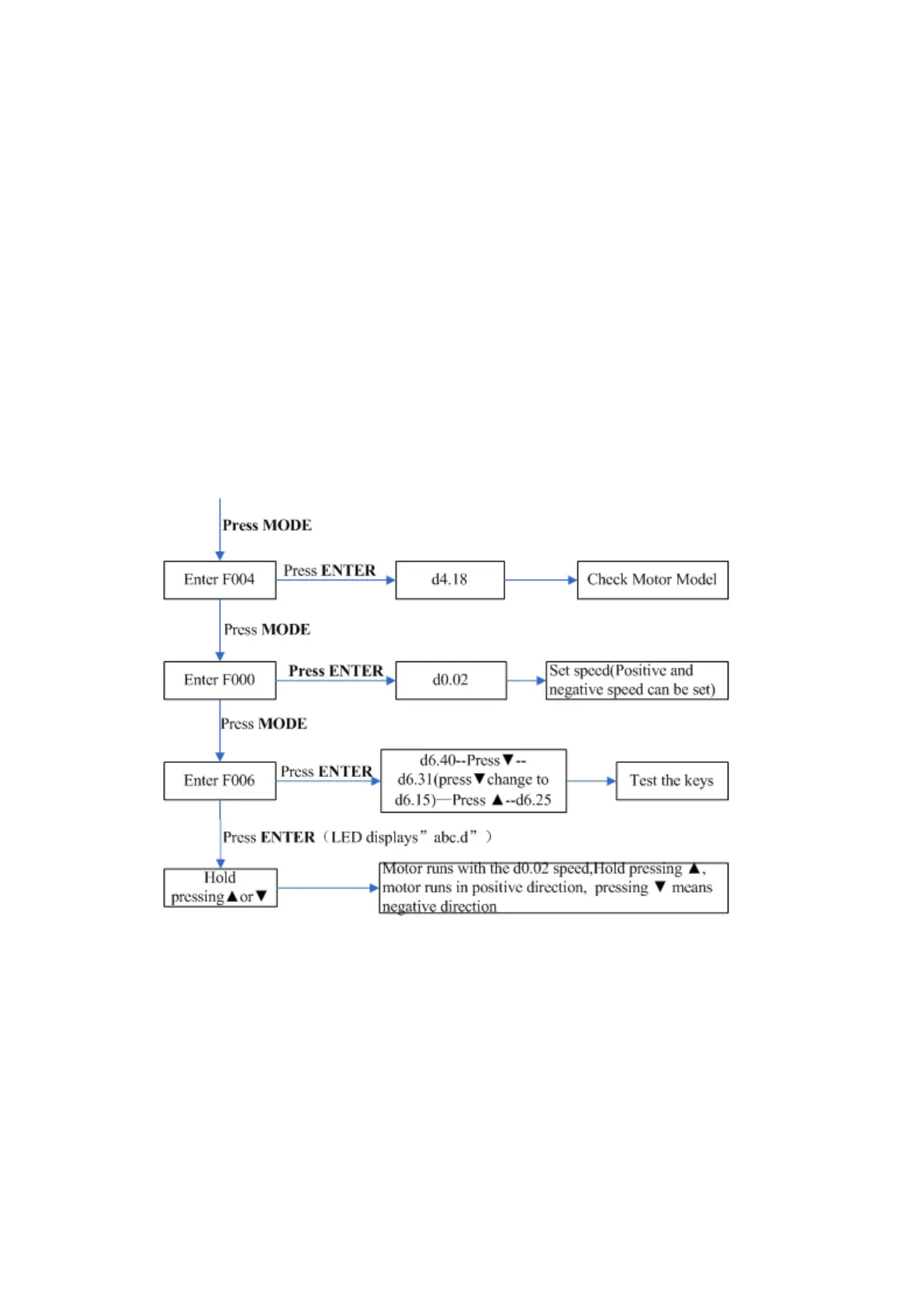 3. Press MODE to enter Group F006. Arrange a test for keys, with the default value of d6.40. Firstly, press