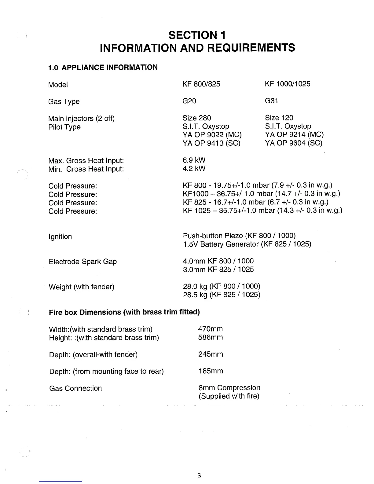 Kinder KF 800 - Appliance Information; Fire Box Dimensions (with Brass Trim Fitted)