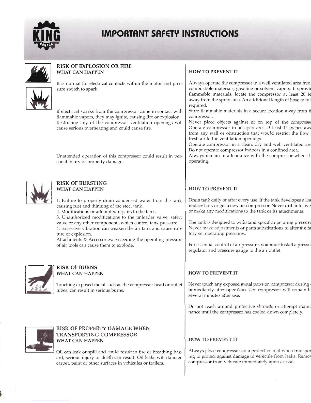 King Canada 8469 - Important Safety Instructions; Risk of Explosion or Fire Hazards; Risk of Tank Bursting; Risk of Burns from Hot Components