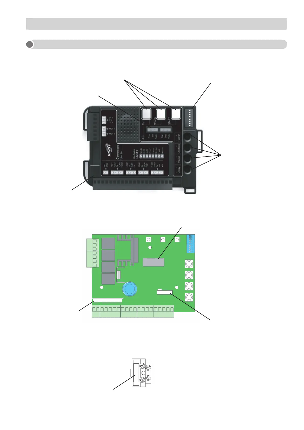 - Predisposition for the 230 Vac card for courtesy light control connection (max 500W, optional) (see paragraph 12E).