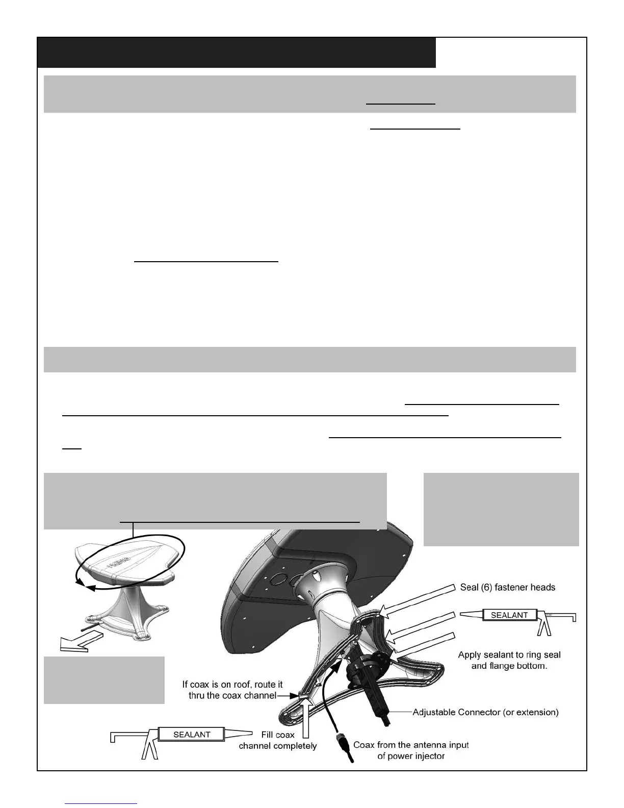 mount is sealed all the way around. Make sure the coax channel and fastener heads are sealed as well.