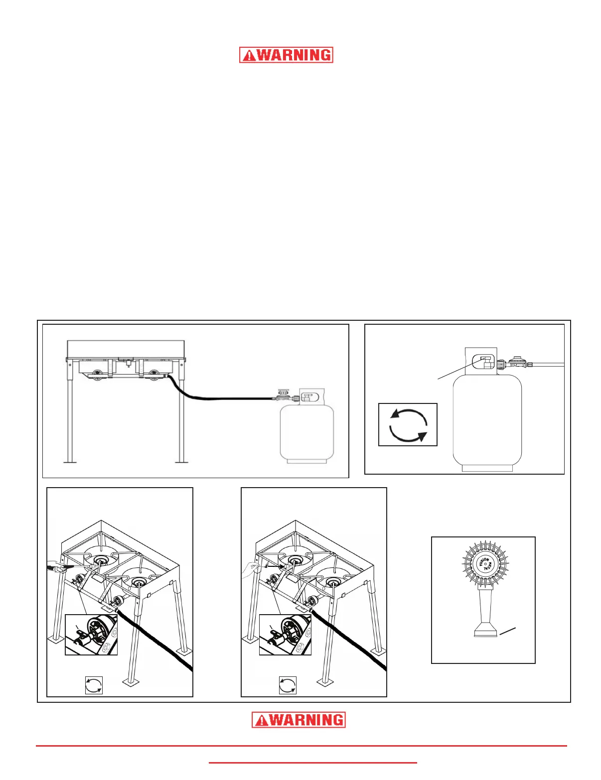 When lighting the burner, if ignition does not occur in 3 to 5 seconds, turn the manual valve(s) and cylinder control off.