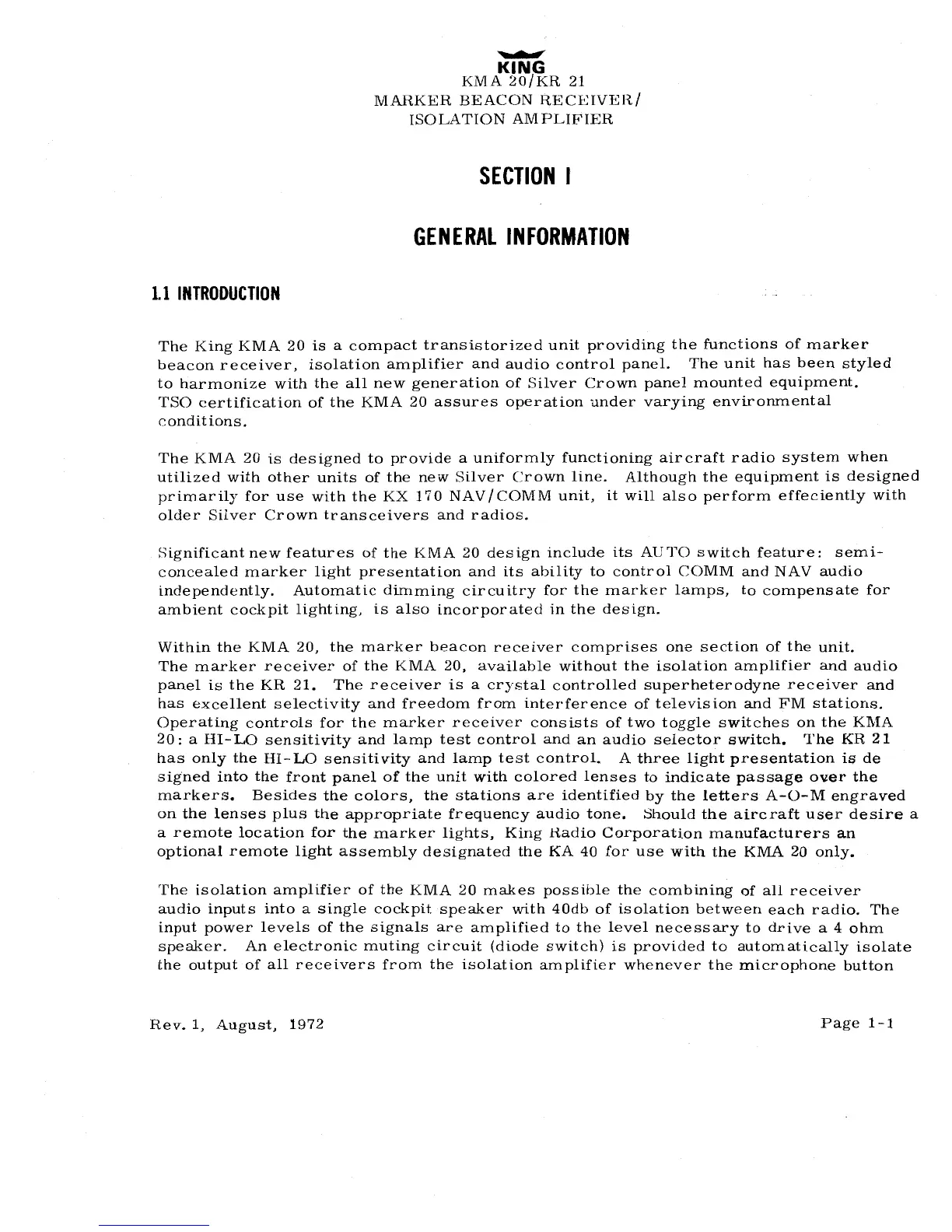 KING KMA 20 - Section I General Information; 1.1 Introduction