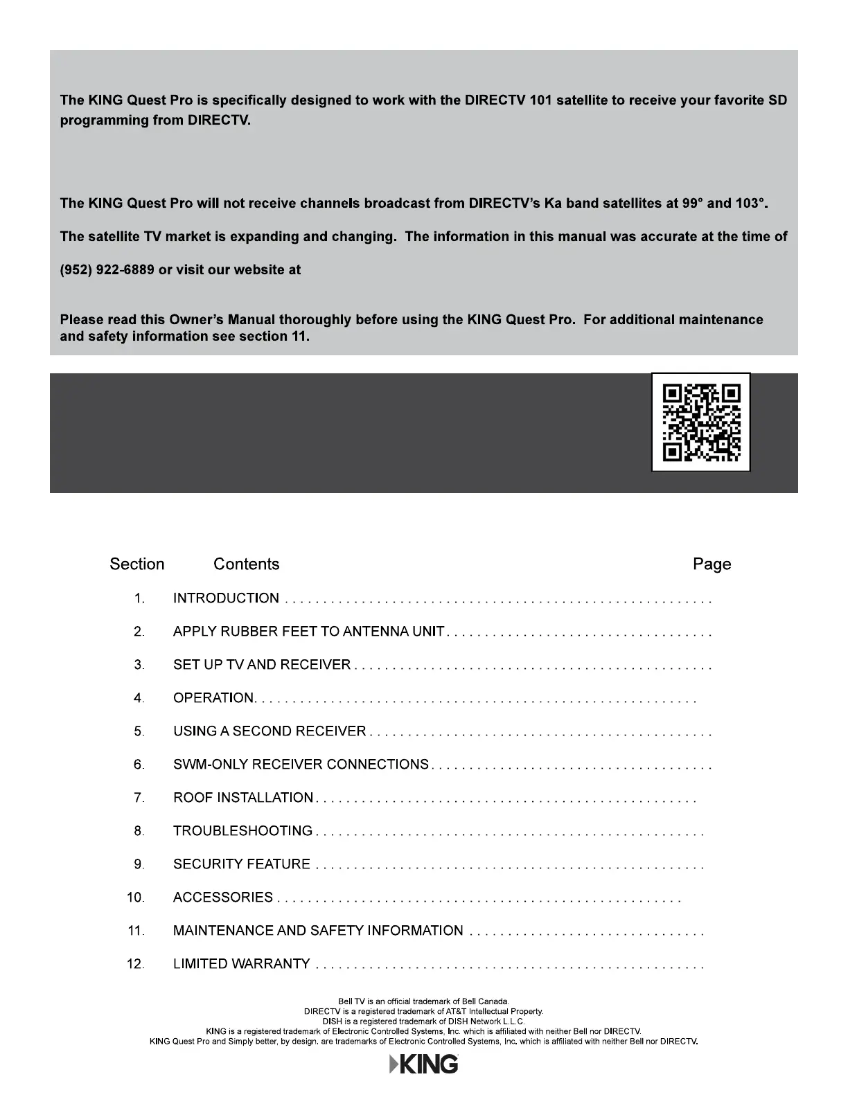 printing. If your KING Quest Pro does not operate as outlined in this manual, please call KING