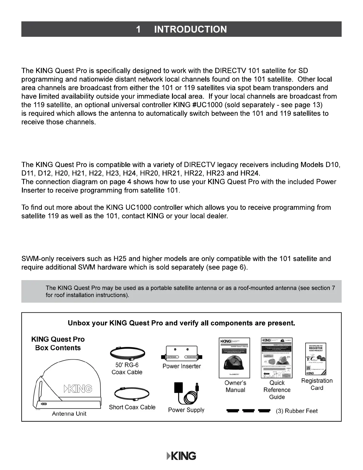 KING QUEST PRO VQ4800 - Introduction to KING Quest Pro; Legacy Receiver Compatibility; SWM-Only Receiver Requirements