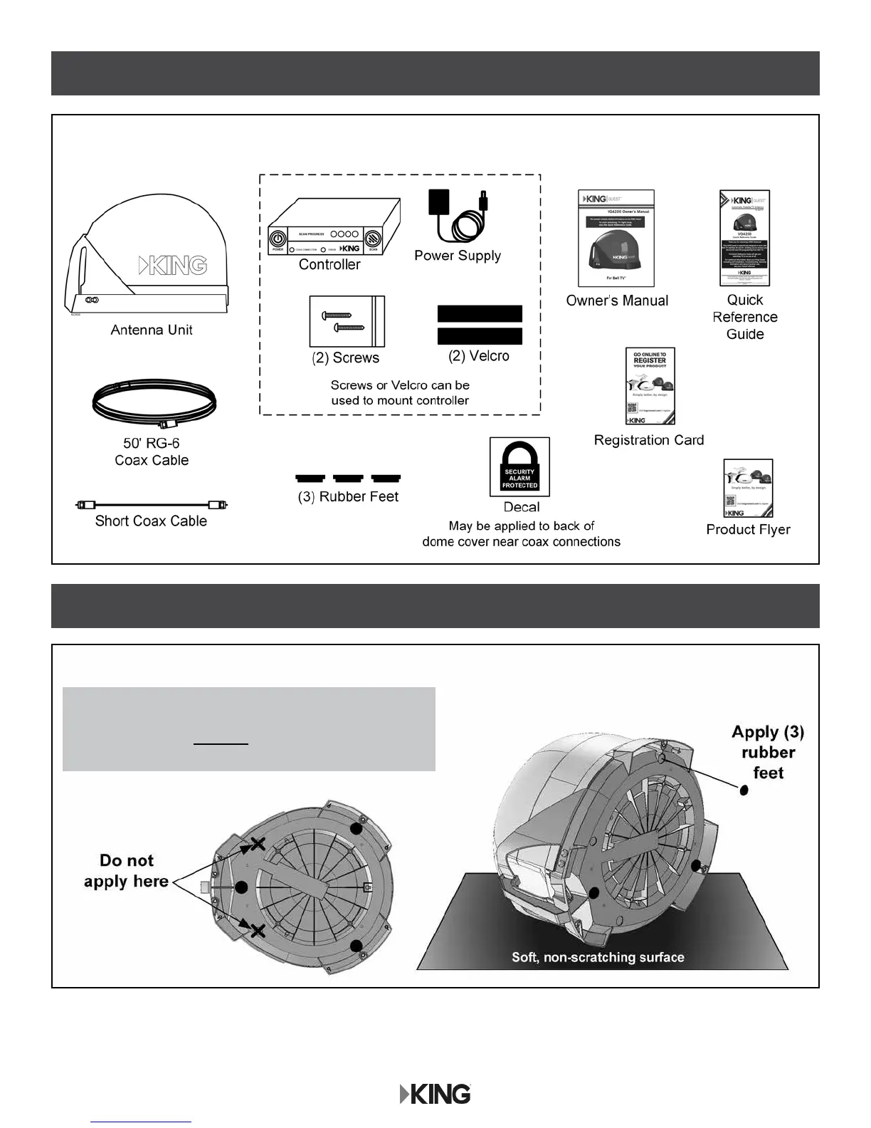 Lay the antenna unit on a soft, non-scratching surface, and apply the (3) rubber feet.