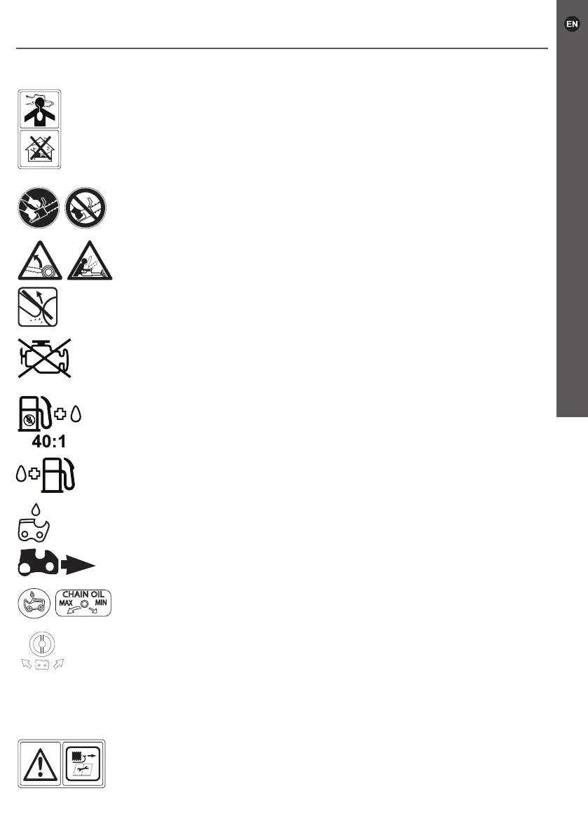 Only refuel unleaded petrol and oil mixture in ratio 40:1. Do not use