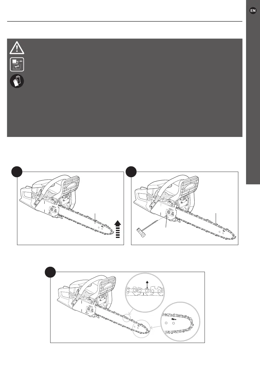 WARNING! Disconnect the spark plug connector before adjusting saw chain