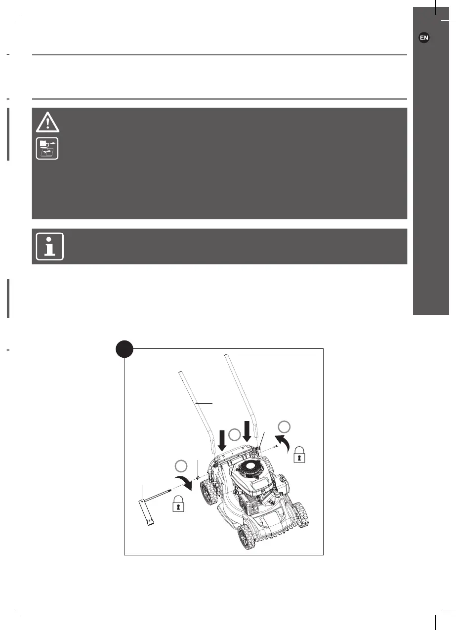 Insert the lower handle bars (5) into the handle supports (17). Align the mounting