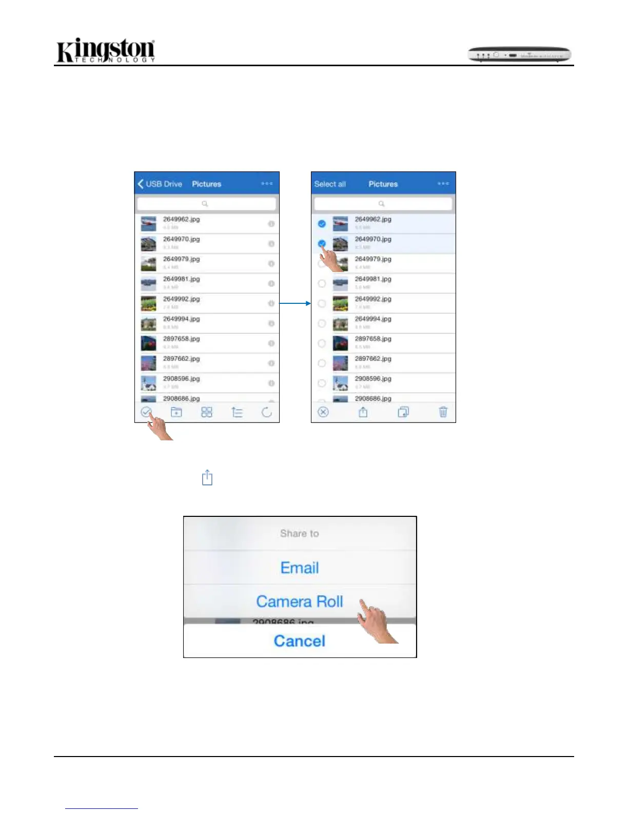 Export a photo from a USB or card to the iOS Camera Roll or Email is another available option in the Kingston