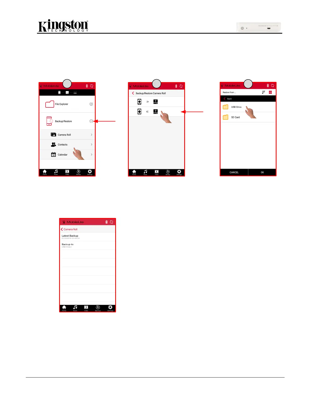 1. Click one of the options, Camera Roll, Contacts, or Calendar, under ‘Backup/Restore’.