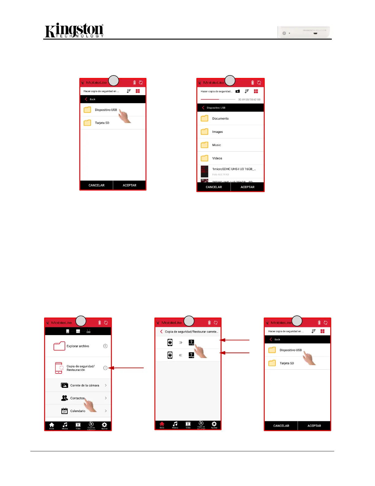 guardados en el dispositivo móvil, en las opciones de almacenamiento USB o Tarjeta SD. Los contactos