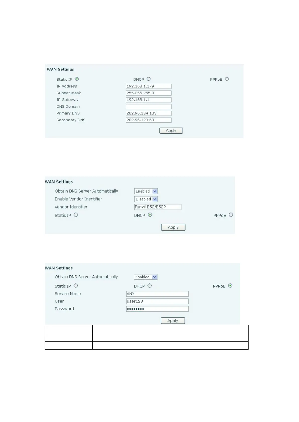 If Static IP is chosen, the screen below will appear. Enter values provided by the ISP.
