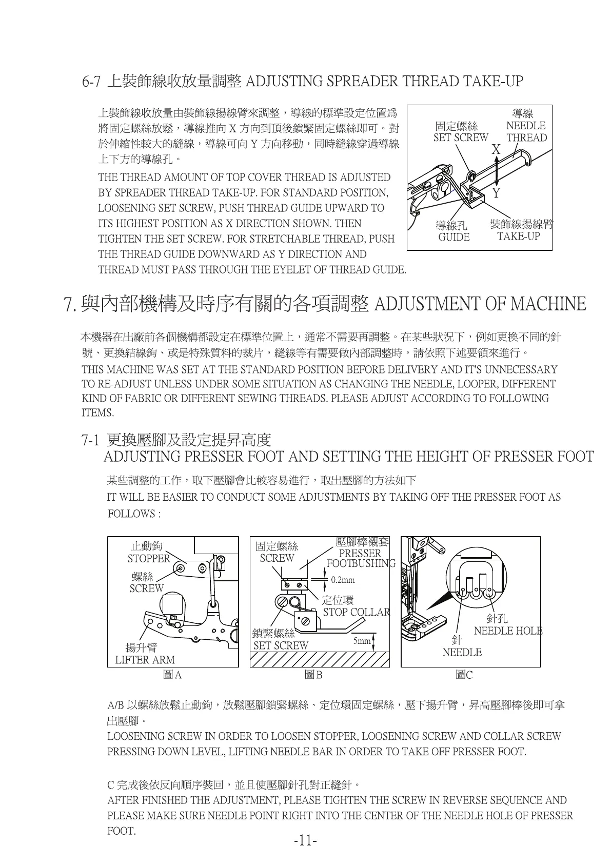 Kingtex FTD Series - Spreader Thread Take-Up Adjustment; Machine Internal Adjustments; Presser Foot Replacement and Height