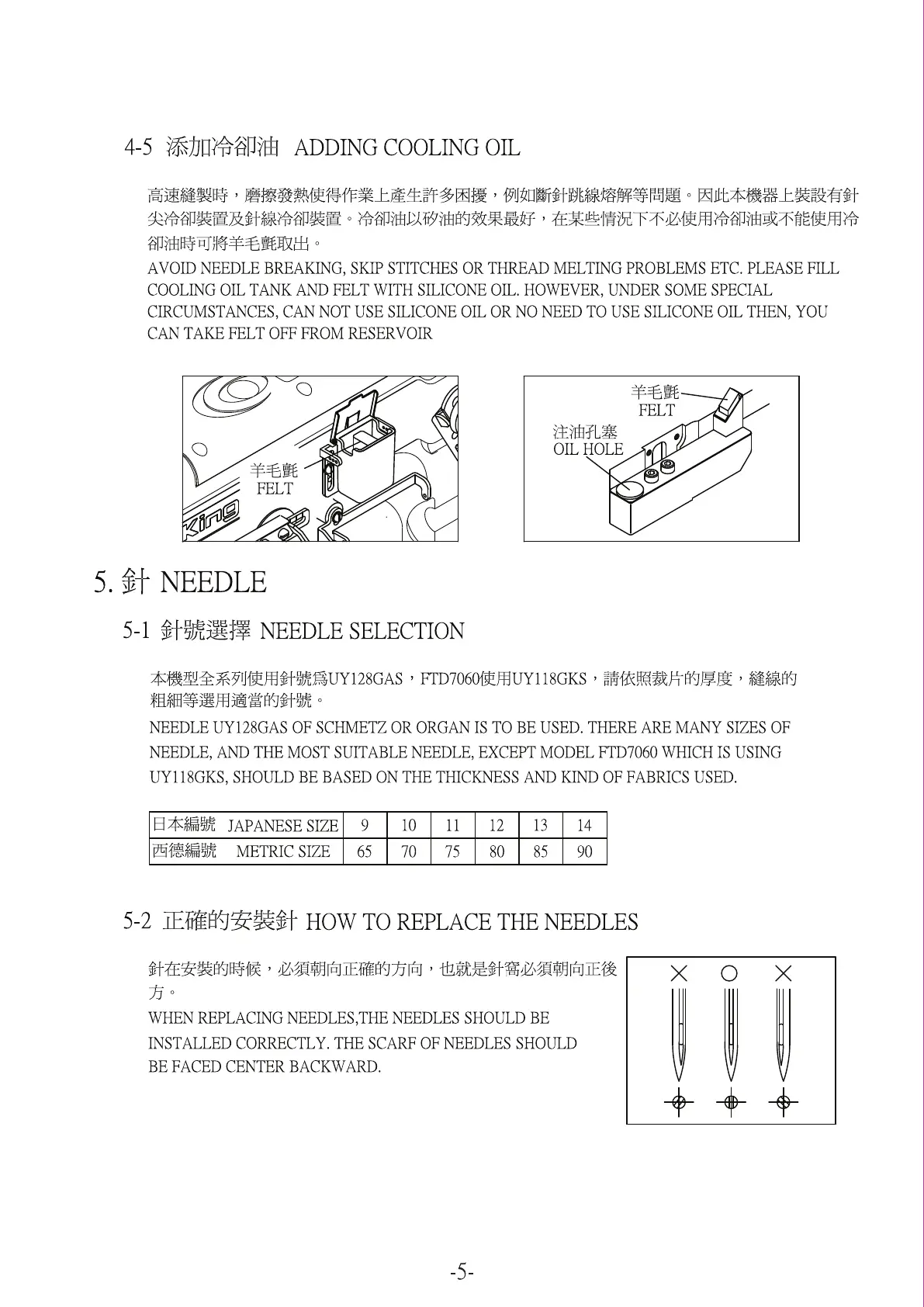Kingtex FTD Series - Adding Cooling Oil; Needle Selection and Installation; Needle Number Selection; Correct Needle Installation
