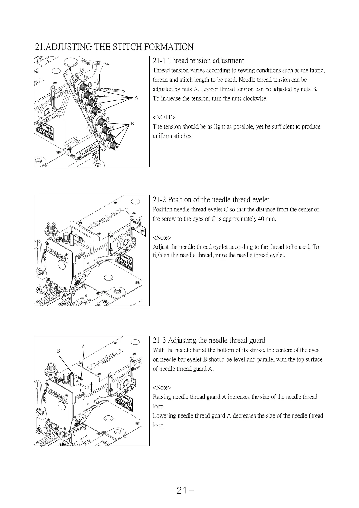Kingtex MT 4512P - 21. ADJUSTING THE STITCH FORMATION; 21-1 Thread tension adjustment; 21-2 Position of the needle thread eyelet; 21-3 Adjusting the needle thread guard
