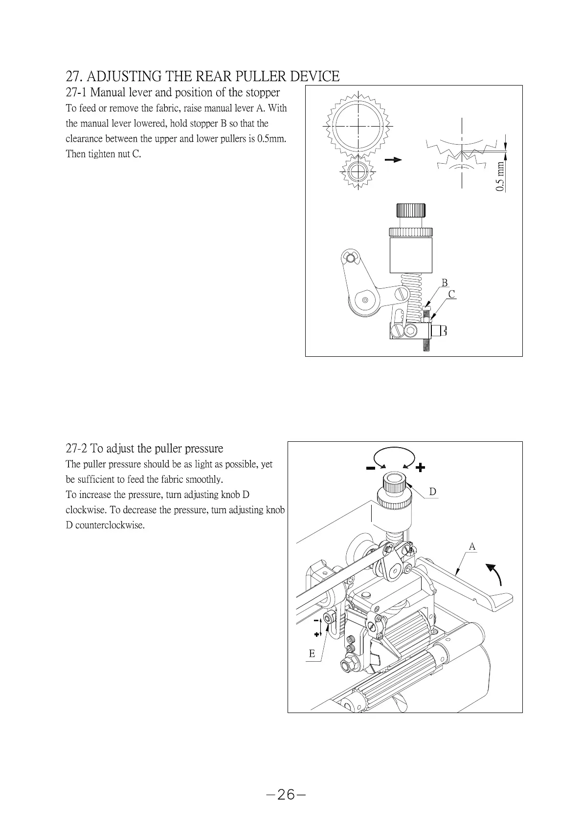 Kingtex MT 4512P - 27. ADJUSTING THE REAR PULLER DEVICE; 27-1 Manual lever and position of the stopper; 27-2 To adjust the puller pressure