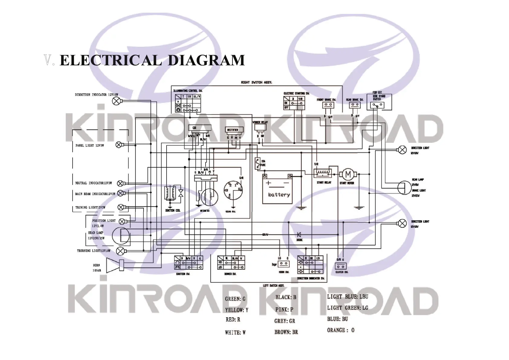 Kinroad XT50Q - VI. ELECTRICAL DIAGRAM; Motorcycle Wiring Diagram; Switch and Component Identification; Electrical System Color Code