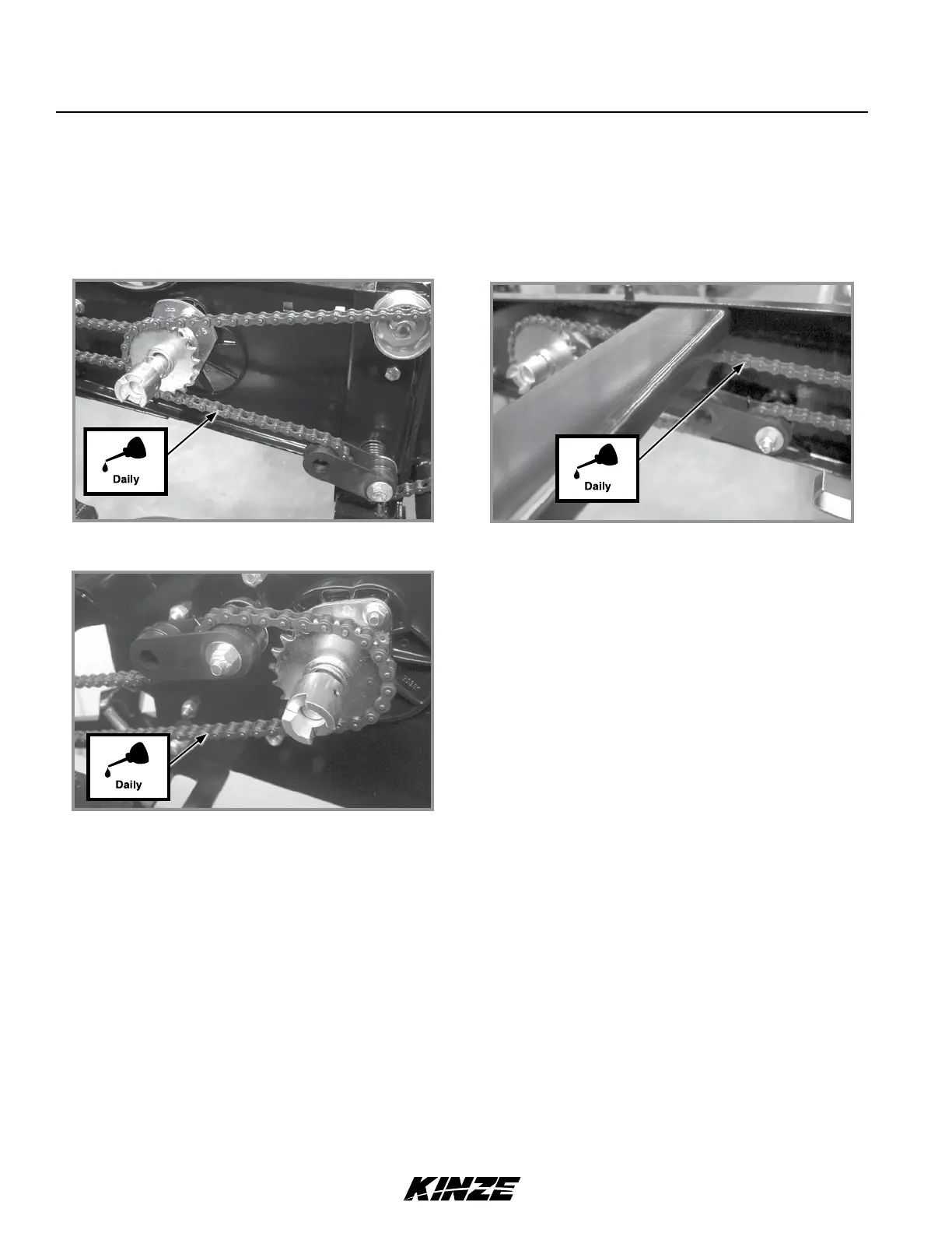 Lubricate all transmission and drive chains daily with a high quality chain lubricant. Extreme operating conditions such