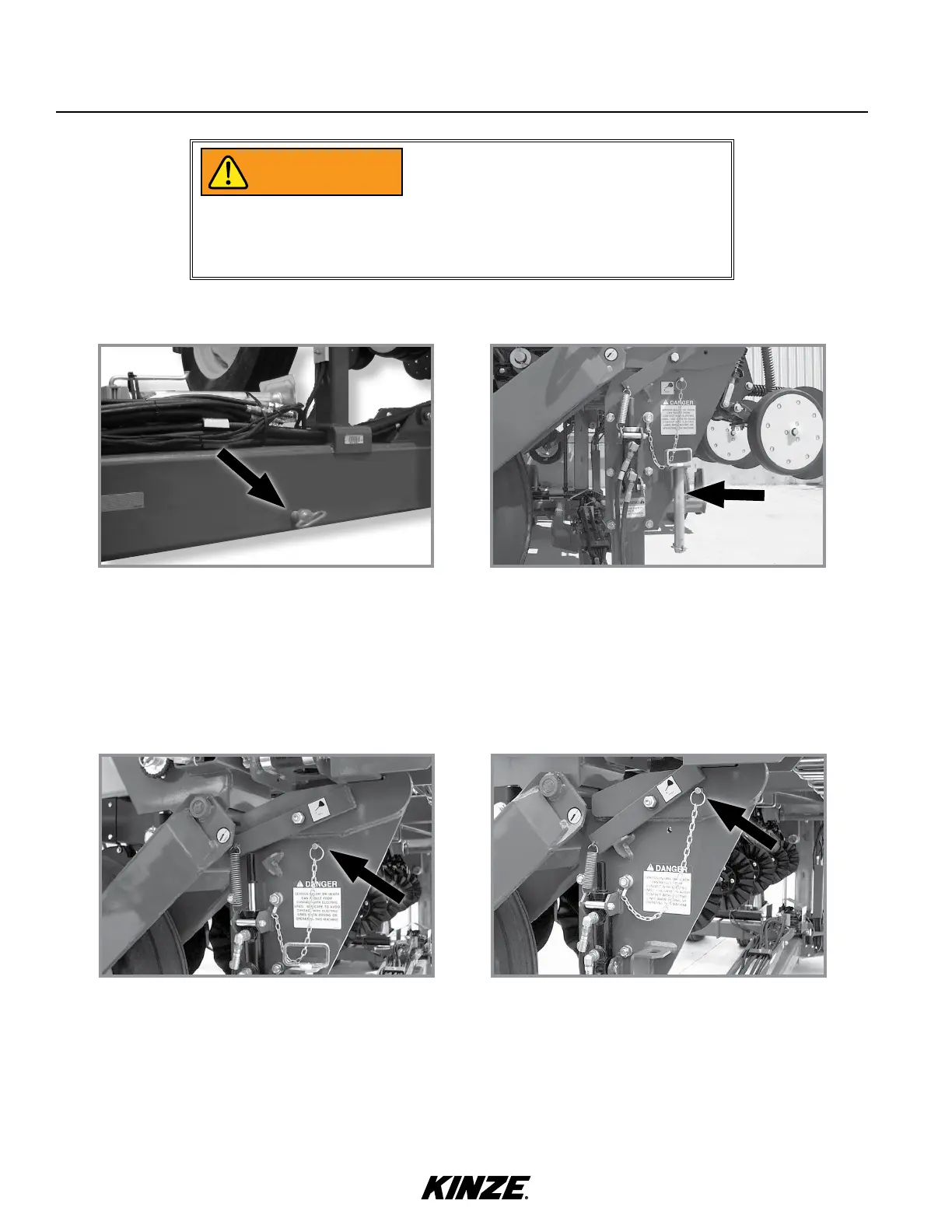 Never transport planter without installing transport latch locking pin. Transport latch locking pin prevents latch bar from