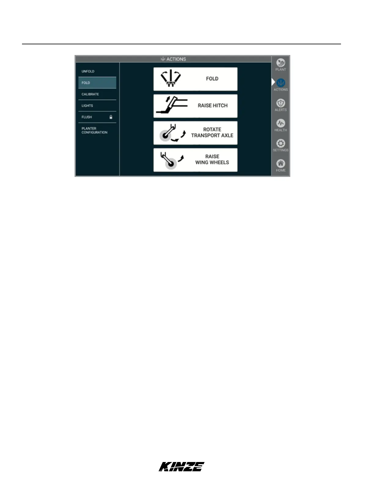 8. Press and hold “RAISE WING WHEELS”. Operate proper hydraulic tractor control to raise wing wheels