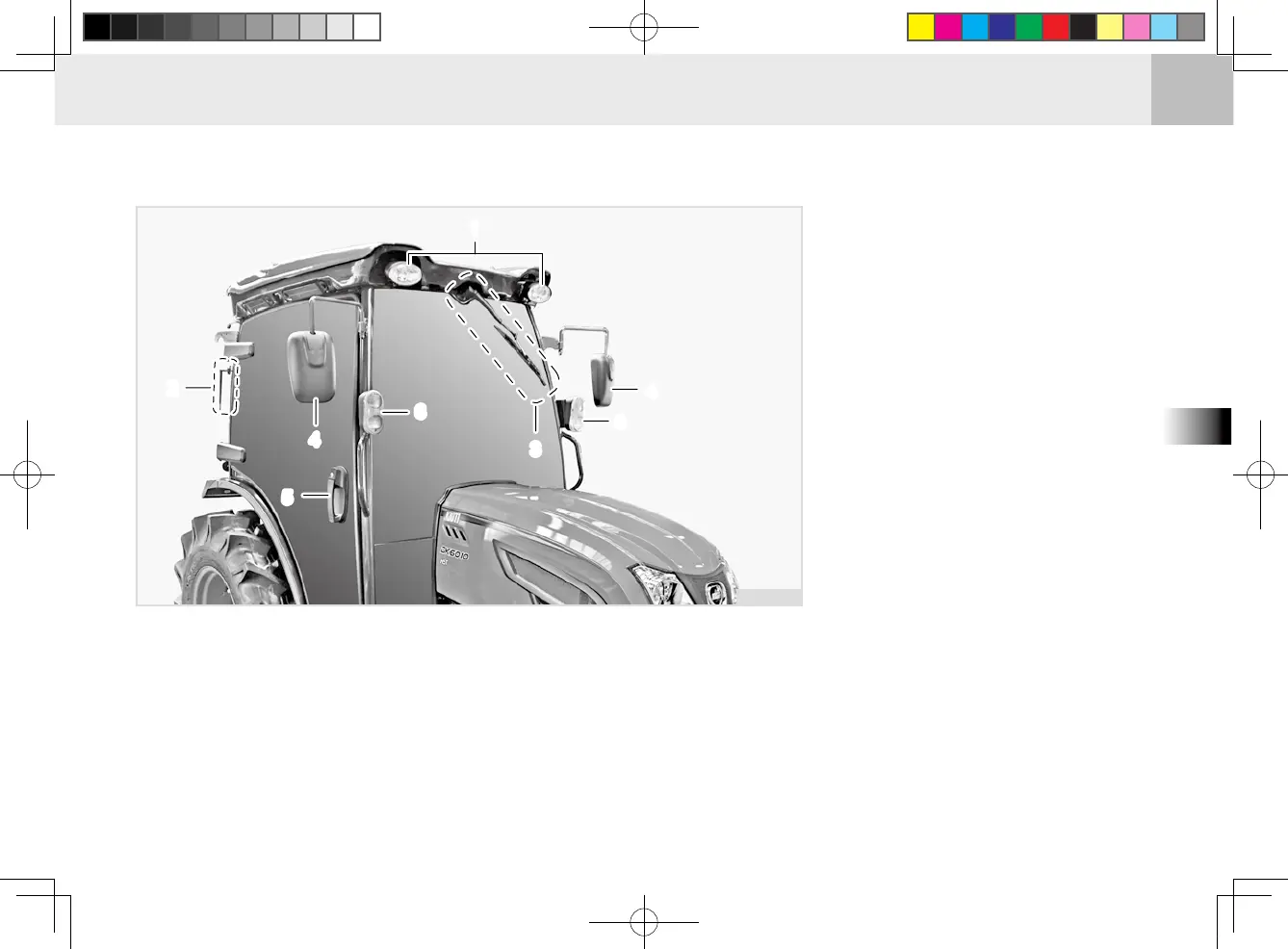 2. This tractor has wide windows as well as outside rearview mirrors on both