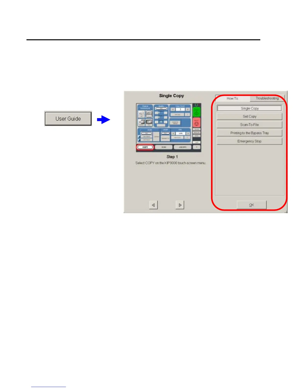 Press the User Guides button to gain access to the KIP printer User Guides on