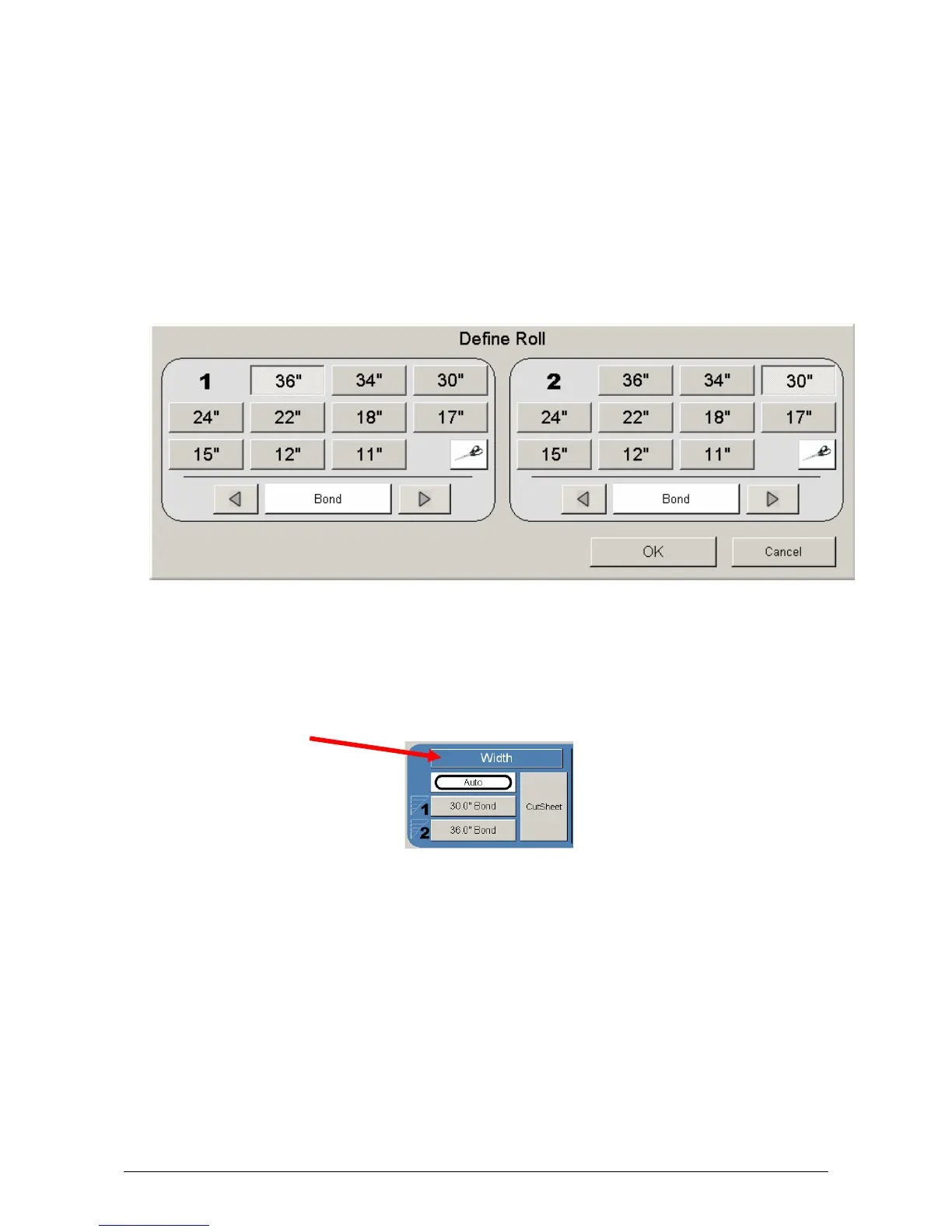 This screen shows 36” bond for deck one and 30” Bond for Roll 2 deck. Scroll