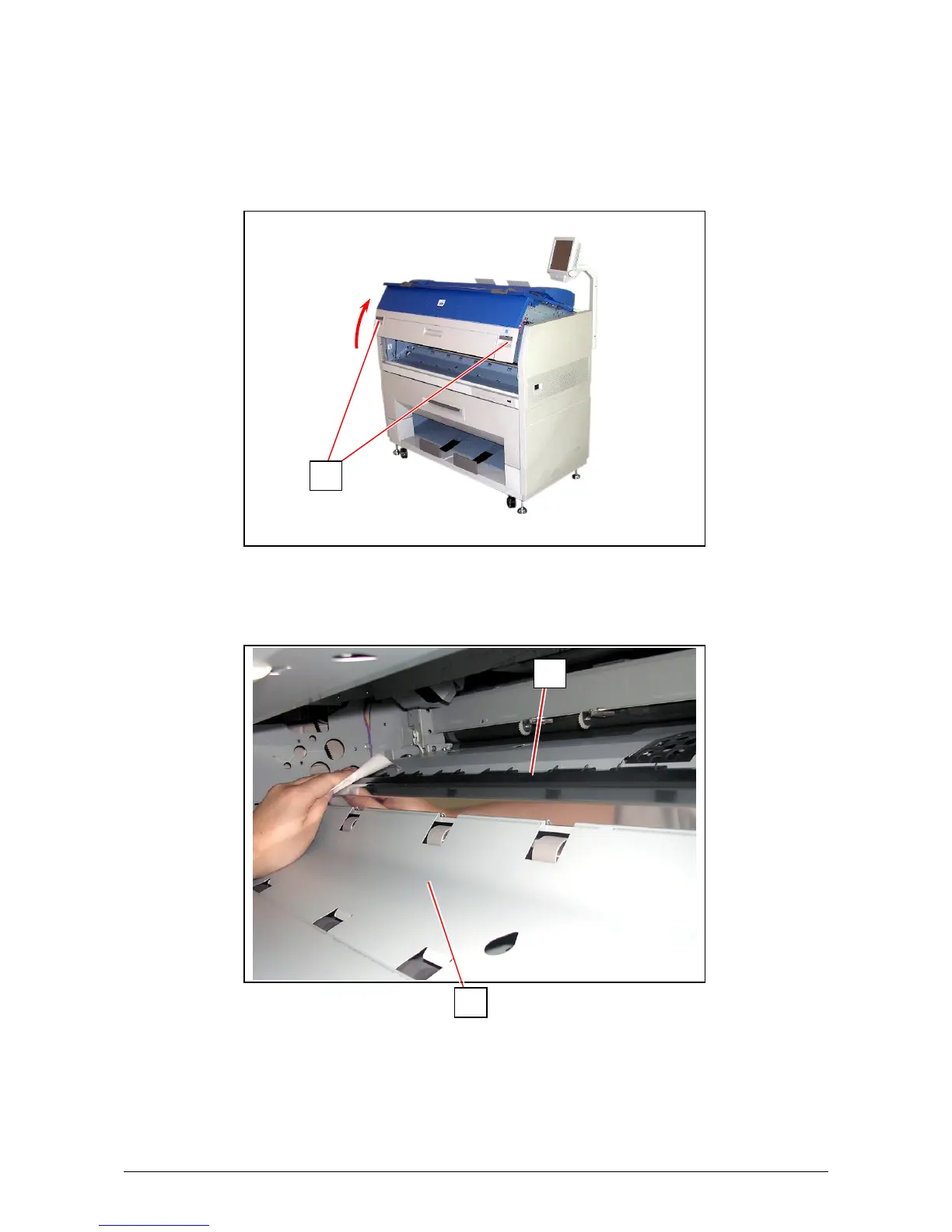 3. Wipe Guide Plate (2) (3: black rubber area) with a soft dry cloth to remove toner or paper dust.