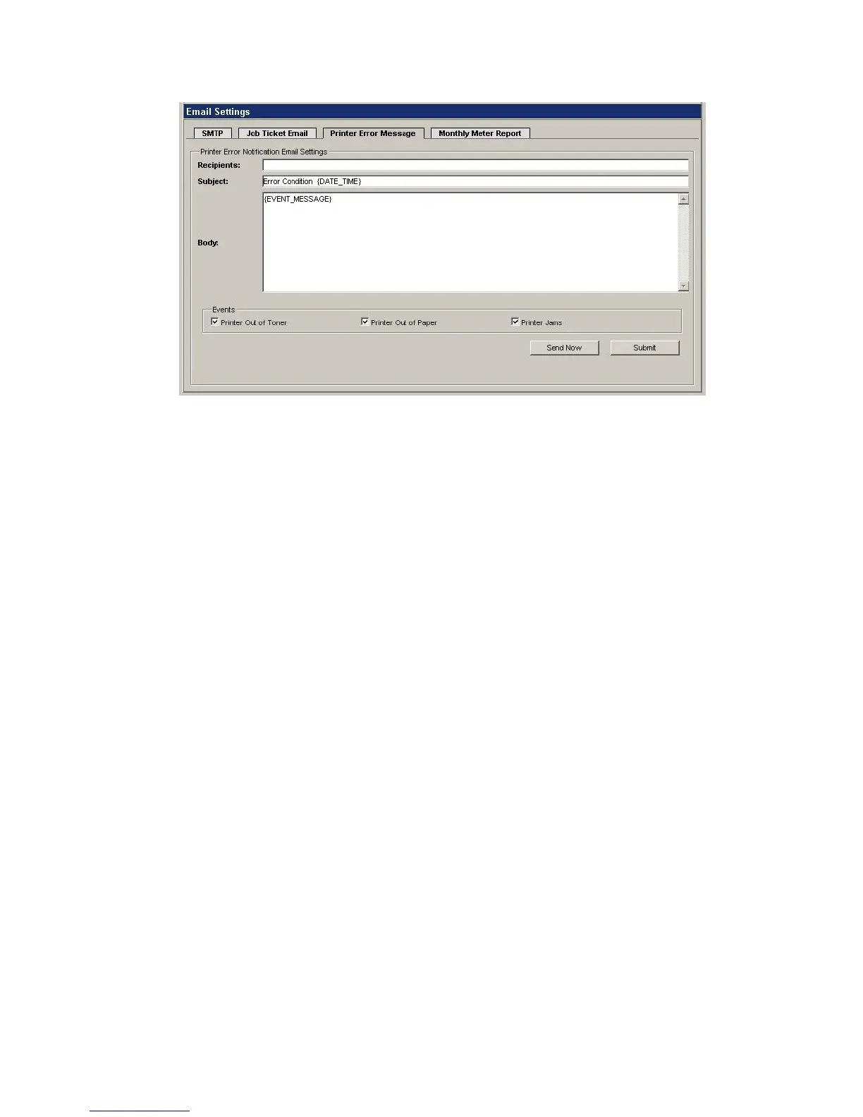 Message, Printer Name, Printer Serial Number, IP Address, Dealer Name, Dealer Phone
