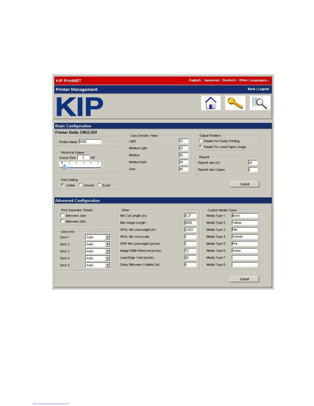This section is for configuring the printer. After making necessary changes click on submit.