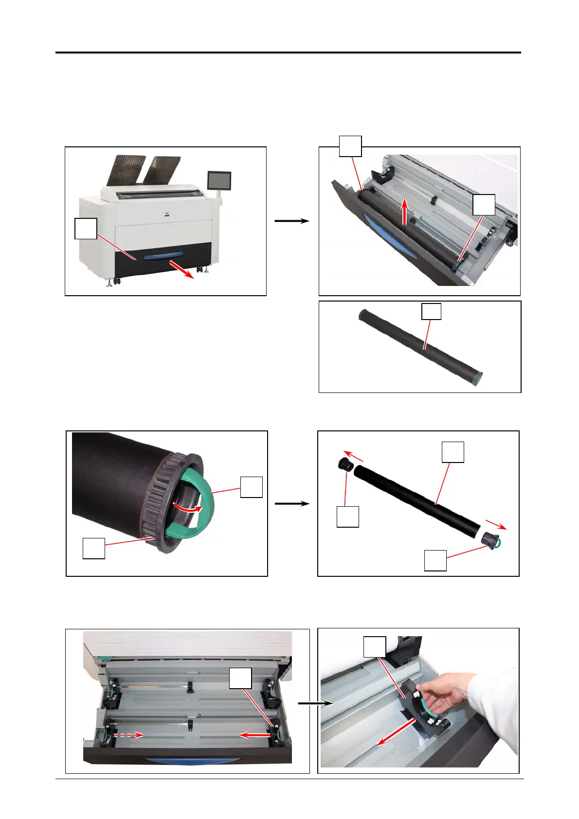 2. Pull the green lever (4) on each Flange (2), which releases the core of roll (3). Remove both
