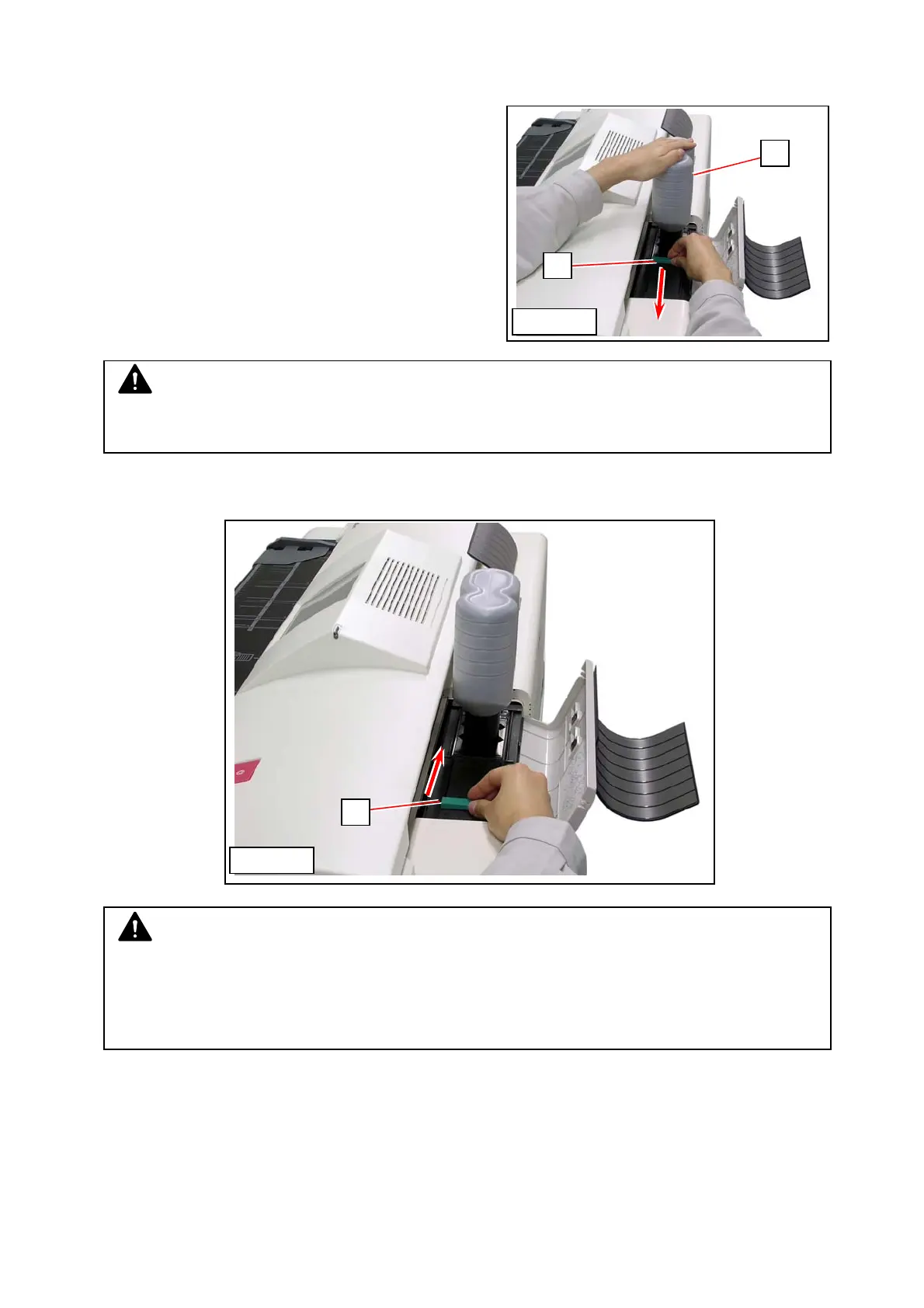 Gently press down the Toner Bottle. Pressing too much makes the lever (28) much heavier.