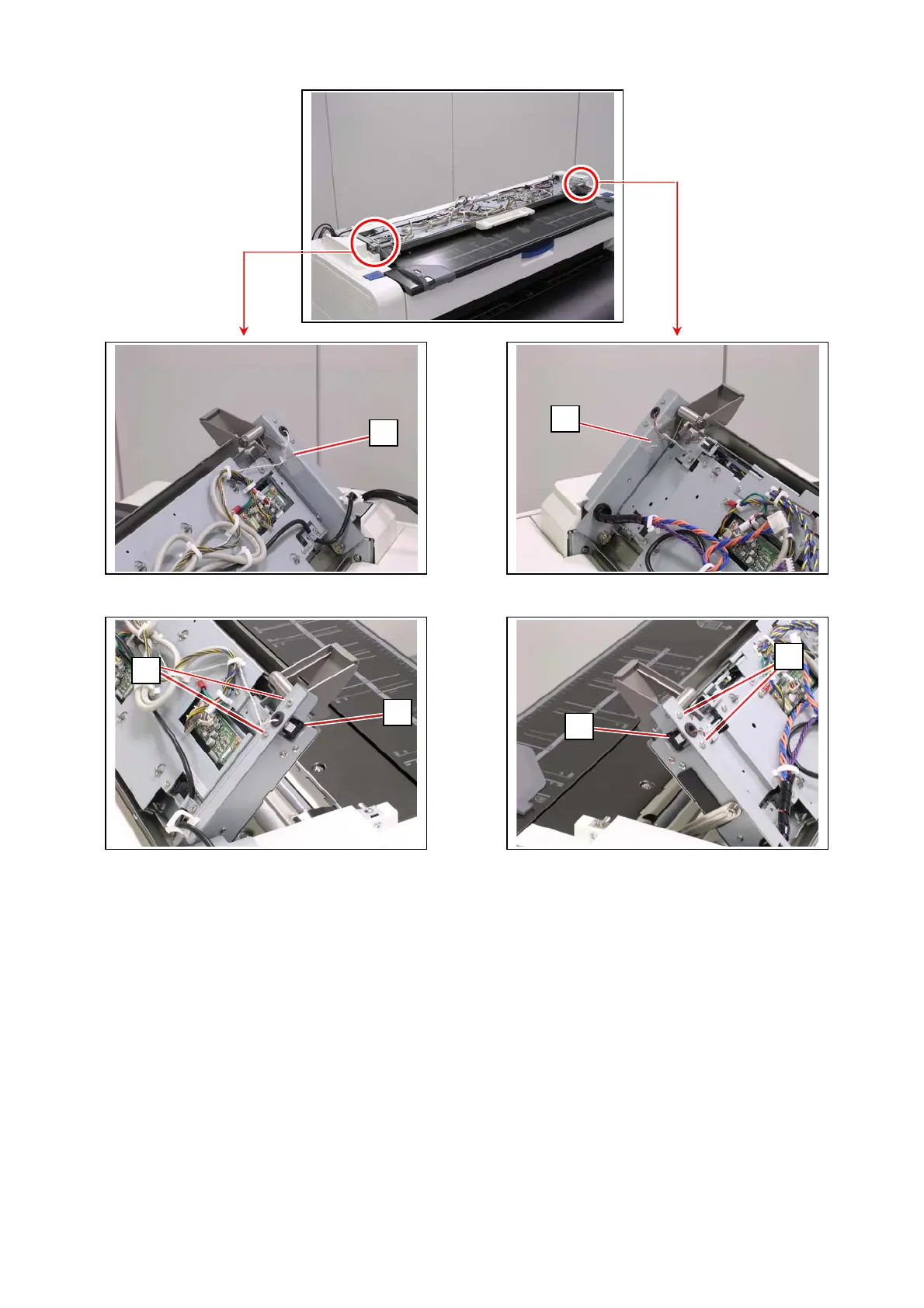 14. Open the Scanner Unit. On both sides, remove the tapes (17) to release the white / brown