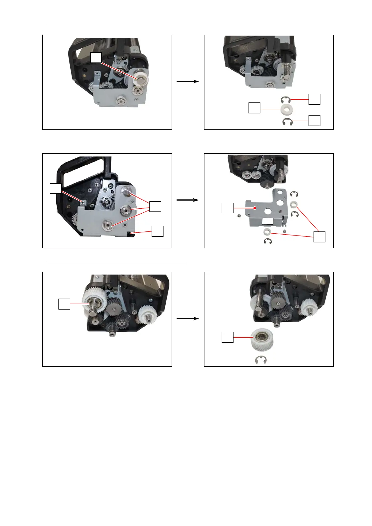 24. Remove 3 Retaining Ring-E (31: E10) and 2 screws (32: M4x6) to remove the Collar (33) and