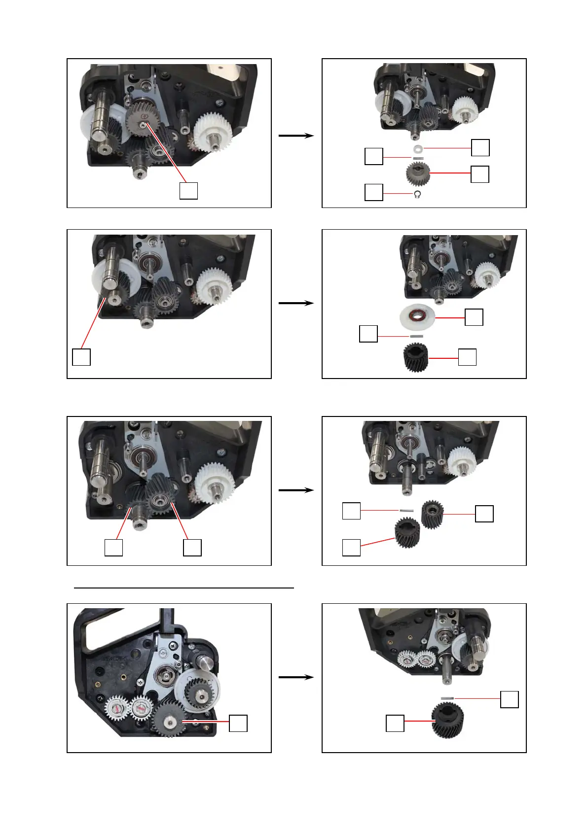 28. Remove the 22T Helical Gear (44). Remove the 24T Helical Gear (45) and the Parallel Pin (46: