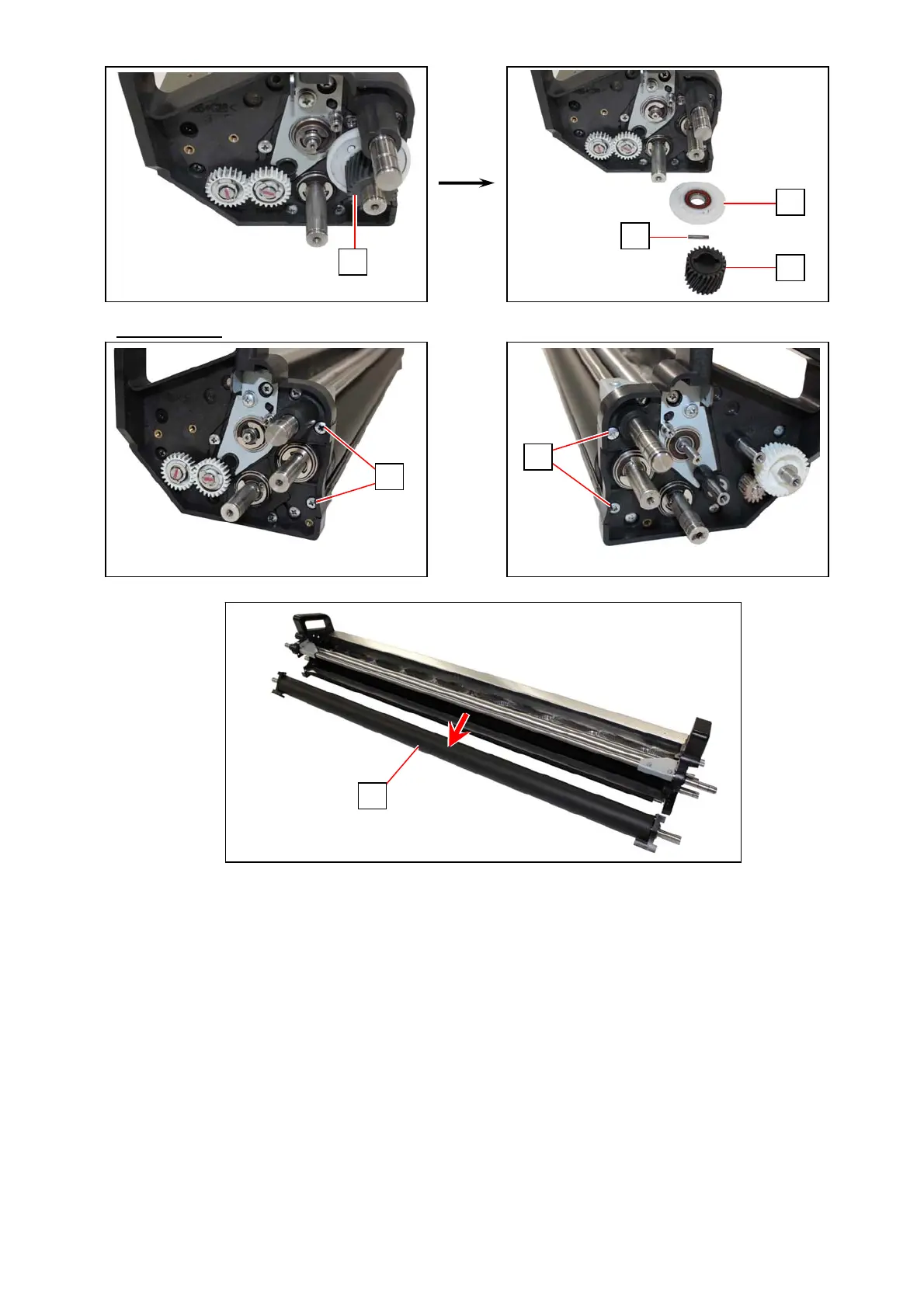 , remove 2 each screw (52: M4x6) to remove the Developer Roller (53).