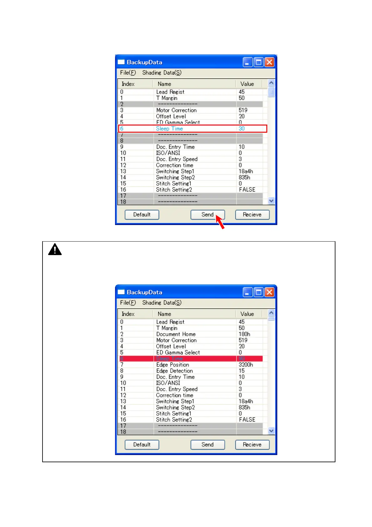 Click [Send] on the bottom. The setting value(s) from the backup data file turns black.