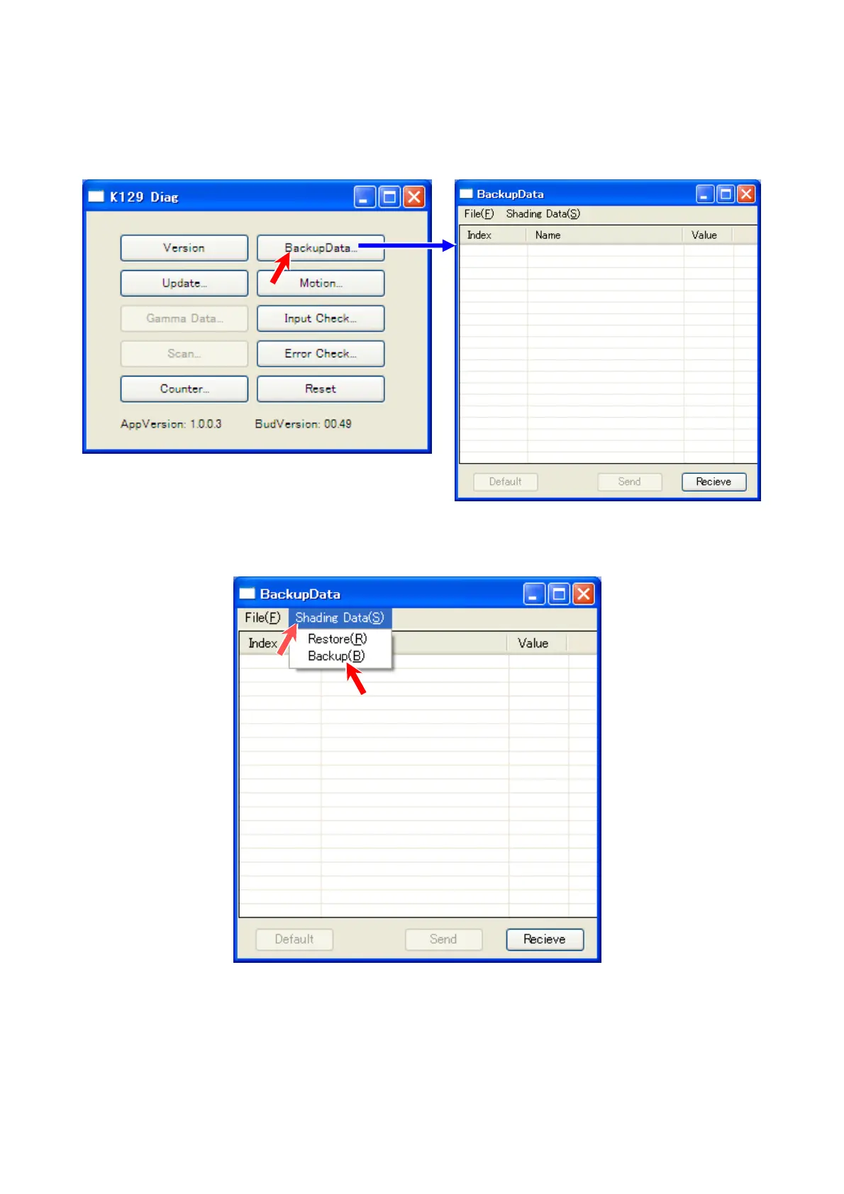 2. Select [Shading Data] menu, and then click [Backup] to recall “Backup Shading Data” sub