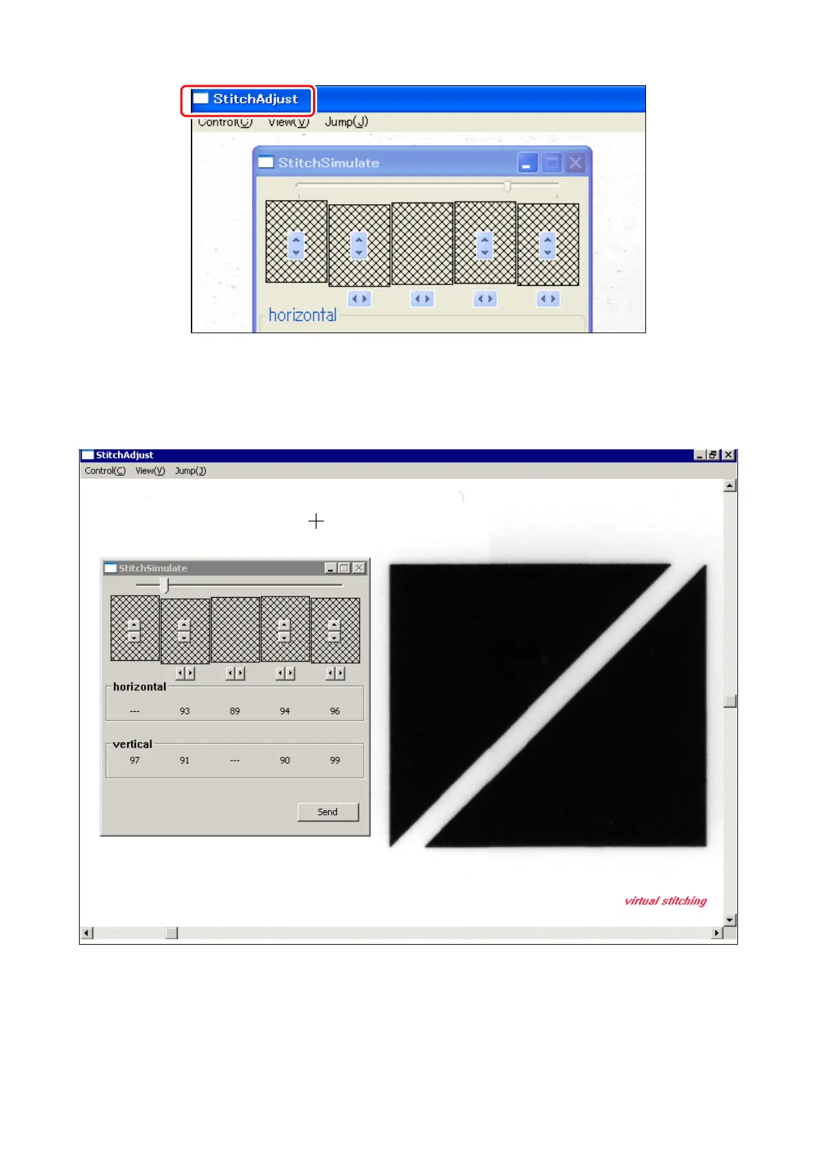 15. When the scanning is finished, two sub windows “Stitch Simulate” and “Stitch Adjust” appear.