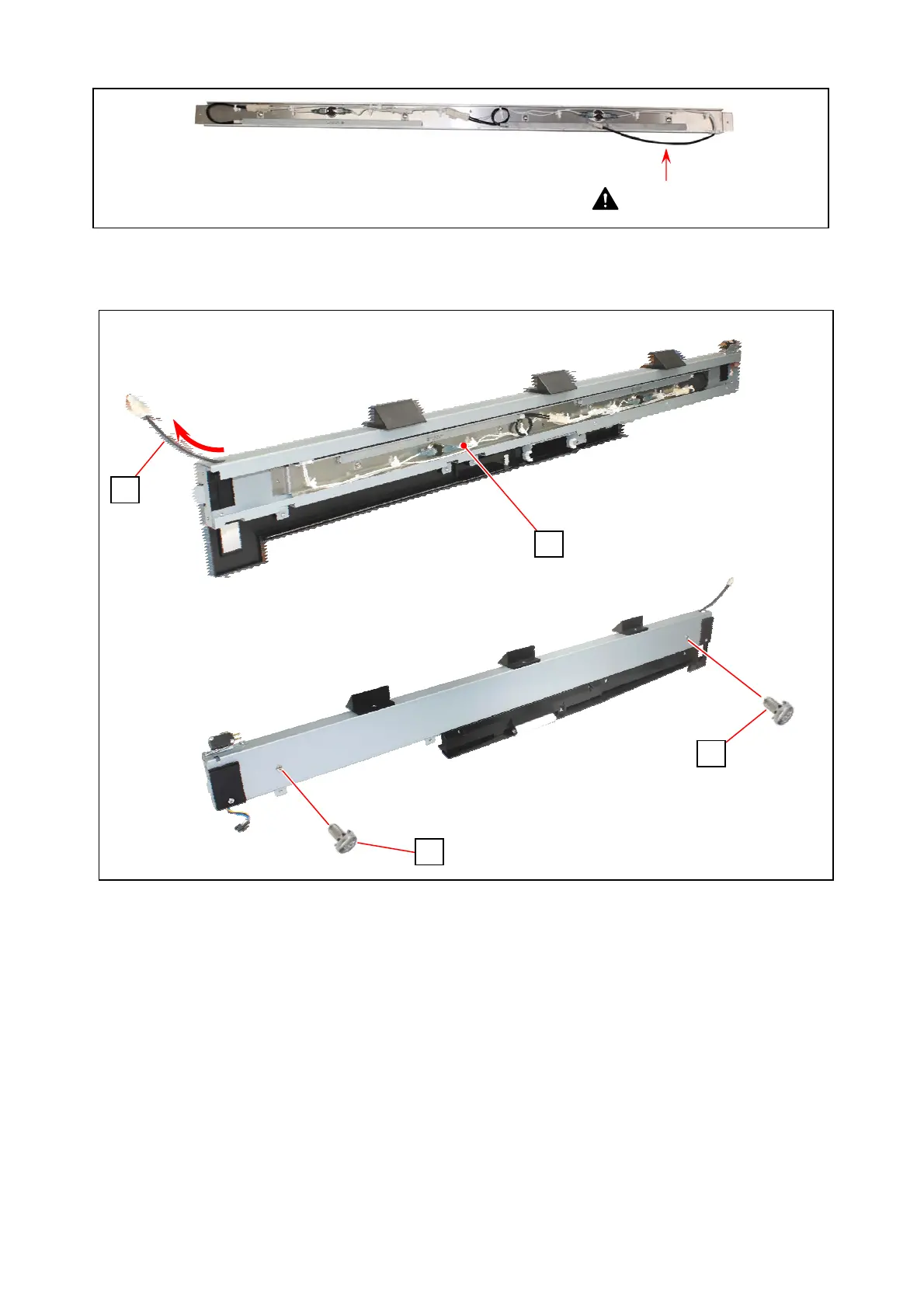 Pass the harness (3) of Dehumidify Heater Assy 2 through the rectangle hole on top right of Guide Plate.