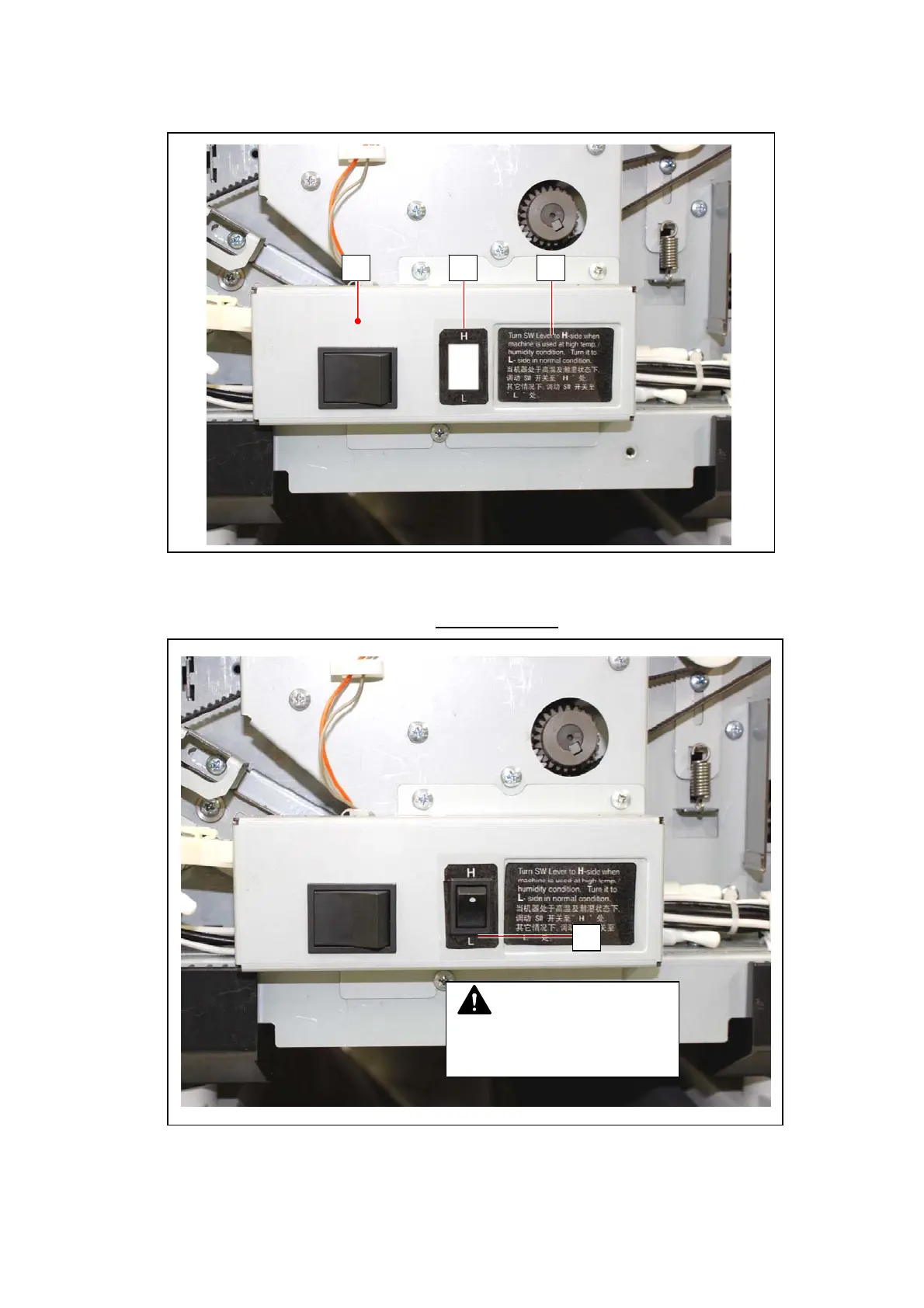 1. Apply the Switch Indication Label (2) and Dehumidify Label (3) to the switch case (1).