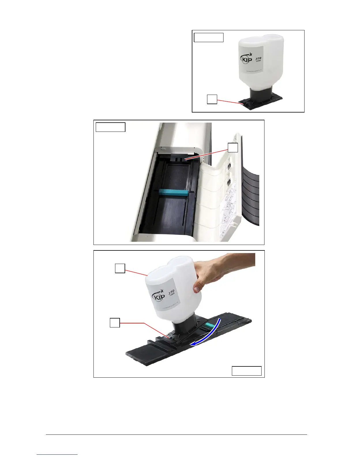 3. Put the dent area (3) under the holder (4) to firmly seat the bottom plate of the Toner Bottle (2)